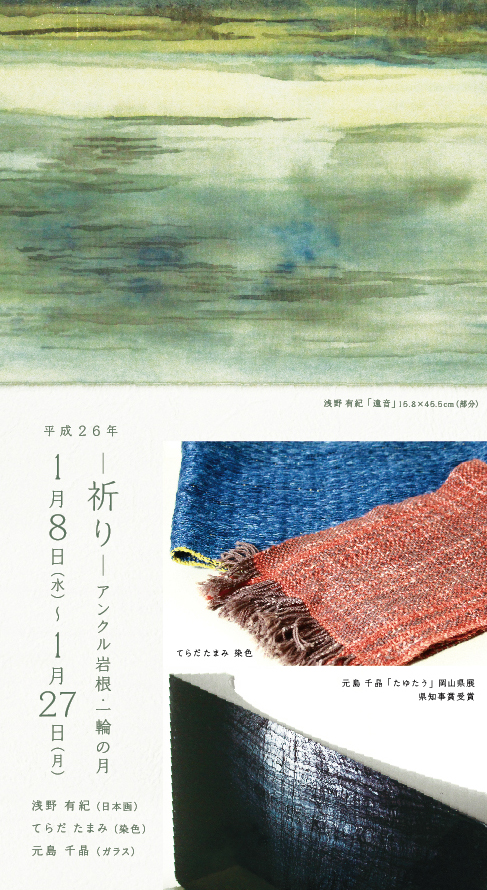 新年あけましておめでとうございます。 昨年8月から岡山市北区中山下にギャラリーを開設してから初めてのお正月です。 長いこと放送を通じてアート・芸術の話で盛り上がりました。芸術・文化の基盤がしっかりある岡山で、 少しでも役にたてないか?との想いから《アンクル岩根のギャラリー》になりました。 今月のテーマは《祈り》。 倉敷芸術科学大学1期生の日本画浅野有紀さんの風景にはいつも祈りの想いがあります。空の輝き《遠音》、描きながらの心の動きが私たちに祈りの感動を与えてくれます。 昨年の県展工芸部門で知事賞受賞の元島千晶さんは同じ大学3回生努力と才能が彼女の方向を決めます。 てらだたまみさんの染織、世界各地に多種多様な様式があります。たまみさんの心を籠めたオリジナル作品をお楽しみください。 今年もよろしくお願い申し上げます。