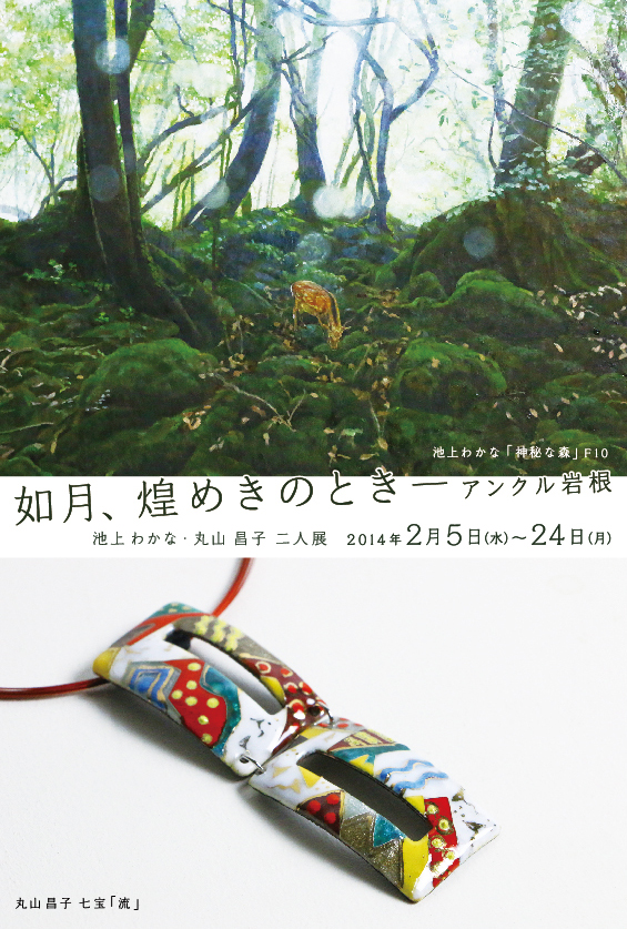 卓越した才能で創元会のマドンナといわれる池上わかなさん。2011年「光差す瞬間」100号が日展特選を受賞しました。 屋久島を歩くわかなさん、「神秘な森」には彼女の心の内が描かれています。丸山昌子さん、七宝では岡山で出色の作家です。 学生の頃には油絵に集中し、その影響が今の煌めきの七宝が生まれてきました。 2月5日(水)から24日(月)まで煌めきの時間をお届けします。
