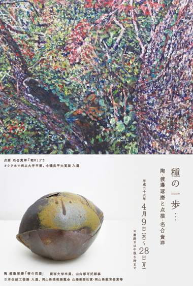 春、花粉をはじめPM2.5などのんびり気分よりもマスクが必要です。 4月のテーマは「種」。今の生物分野では「種」は200万種を数え、実際にはその数倍から十数倍になります。 陶の渡邊琢磨さんは大学でオーケストラの指揮者を務めブラームスの曲に影響を受け、日本人ならばと備前焼に出会いました。 今、彼は瓢箪にそれもアフリカの瓢箪に刺激を受けています。水筒や酒の貯蔵に抜群の役目を果たす。 絵画の名合貴洋さんはオクラホマ州立大学で化学の研究をしていました。が、自分の生きる道を探している時にモネの睡蓮に出会い 一昨年から画業に入りました。昨年難関の小磯良平大賞入選するなどそれぞれの道への「種」はここにもありました。 この二人のダイナミックな活動を是非ご覧ください。