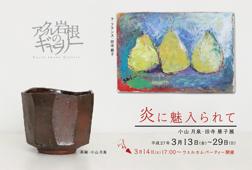 東京・葛飾といえば寅さんの故郷!小山月泉氏は昭和34年に誕生。 20代前半2代3代藤原楽山氏に師事、その実力は眼を見張るものがあります。 平成9年登り窯20年穴窯を築炉。田部美術館大賞や織部現代茶陶展でその実力を発揮、 今皆さまに磨き・箆使い等ご覧頂きたいと思います。 田寺慈子さんは炎の画家三岸節子に憧れ大連で出生の後、絵画の道に入ります。 フォービックなタッチが私たちの心を動かします。東京と大連、実力のある二人の展覧会を 3月13日から29日まで開催します。是非ご覧ください。